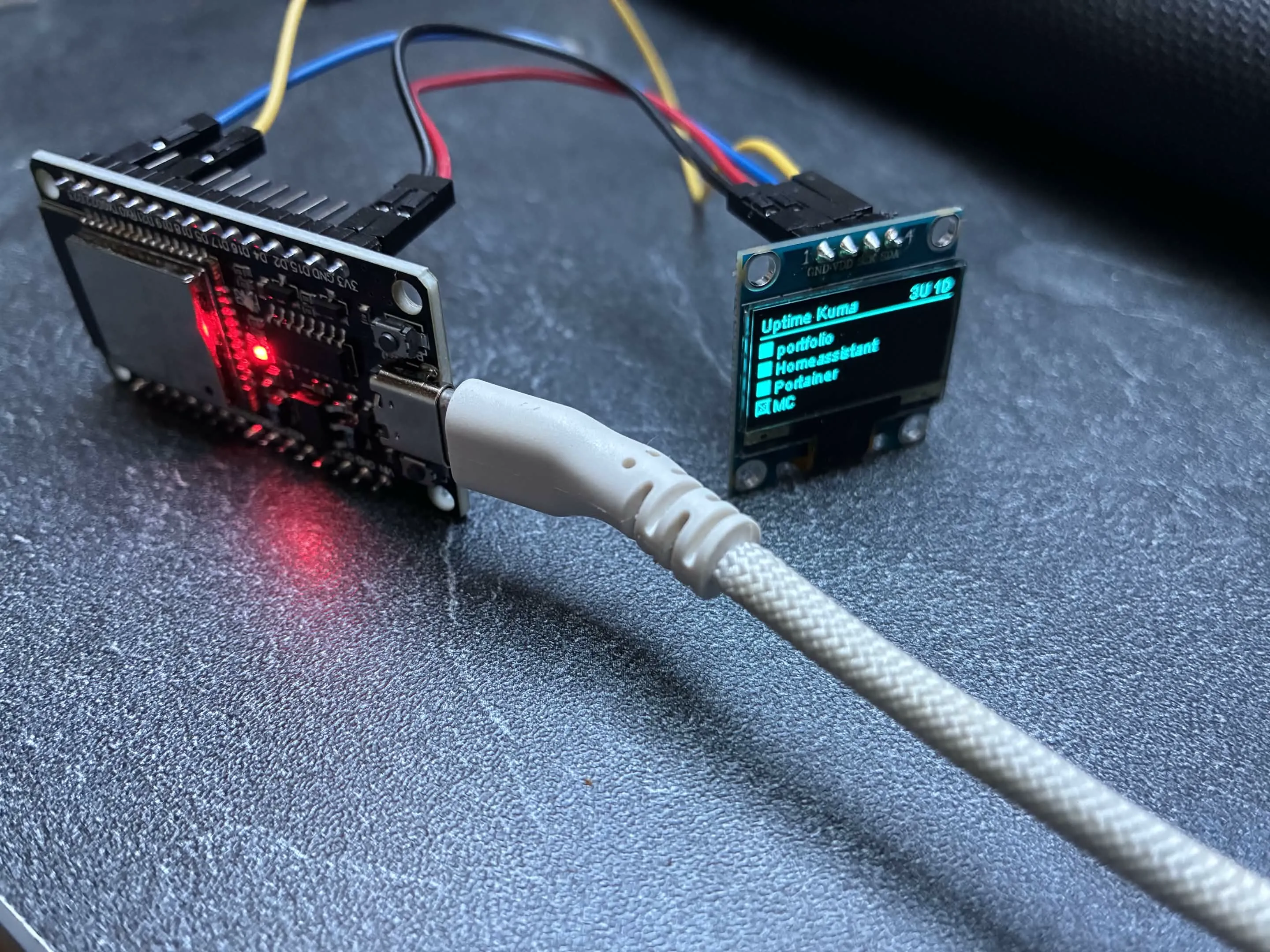 Projet personnel en évolution continue. L'objectif initial était de déployer des services conteneurisés sur un Raspberry Pi 5, en apprenant à gérer les contraintes d'un matériel à ressources limitées. L'infrastructure actuelle repose sur Docker Compose et fait tourner plusieurs services : Apache/PHP pour ce portfolio, un serveur Minecraft, Home Assistant pour la domotique, Pi-hole pour le filtrage DNS et le blocage de publicités, un reverse proxy pour l'accès distant, Portainer et Netdata pour la supervision, ainsi qu'un conteneur de monitoring des autres conteneurs. Un NAS Synology complète l'écosystème pour le stockage et la sauvegarde des données. Dernier ajout : un ESP32 connecté à un écran OLED SSD1306 qui affiche en temps réel le statut des services depuis Uptime Kuma. L'ESP32 interroge l'endpoint /metrics de Kuma toutes les 15 secondes via une API key, parse les données au format Prometheus, et affiche chaque monitor avec un indicateur UP/DOWN - avec défilement automatique si plus de 4 services. Ce projet m'a permis de mettre en pratique mes apprentissages en réseau et administration système acquis à l'ESEO et lors de mon semestre à la Politechnika Wrocławska. Je continue à l'enrichir en ajoutant des services selon mes besoins.