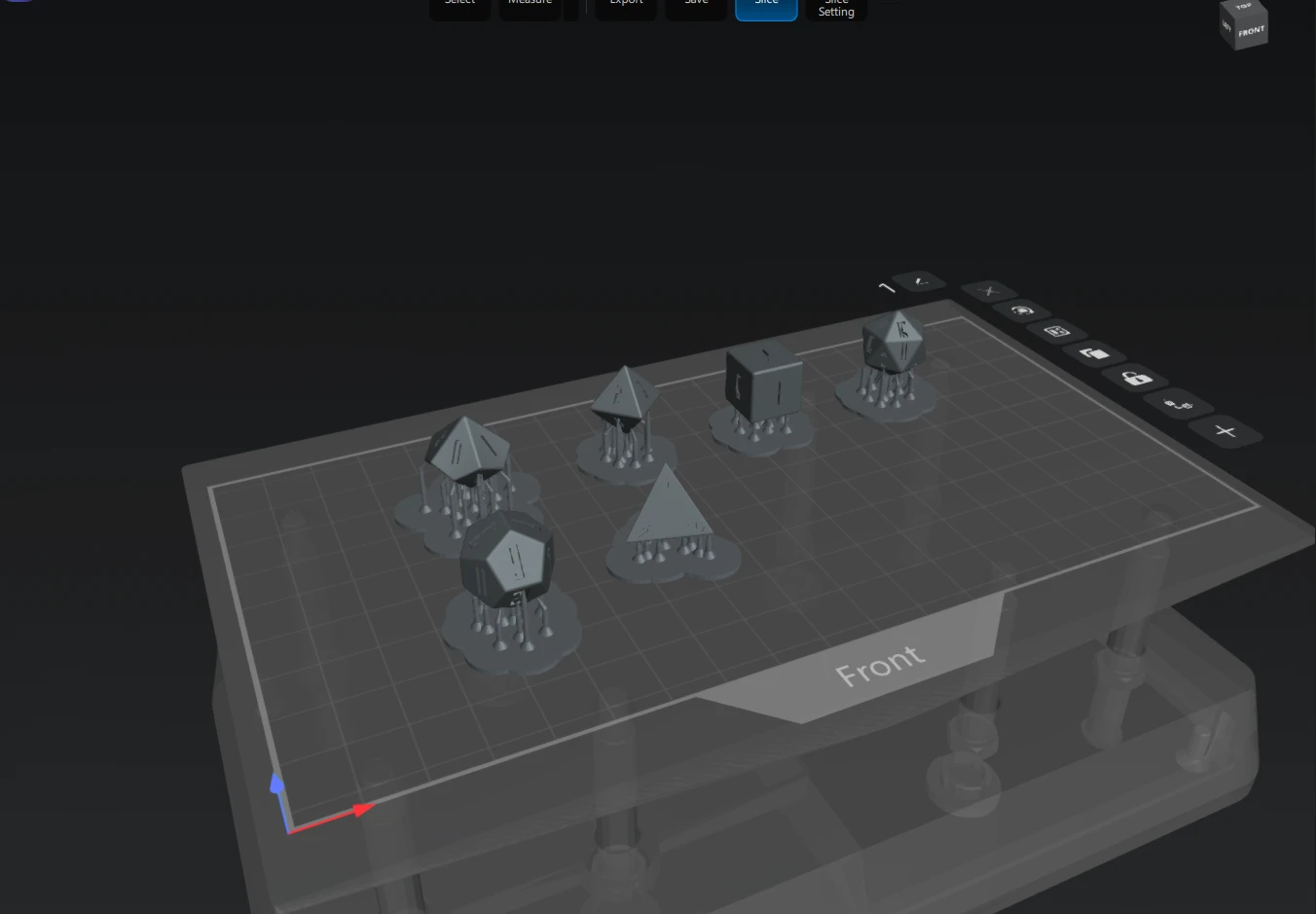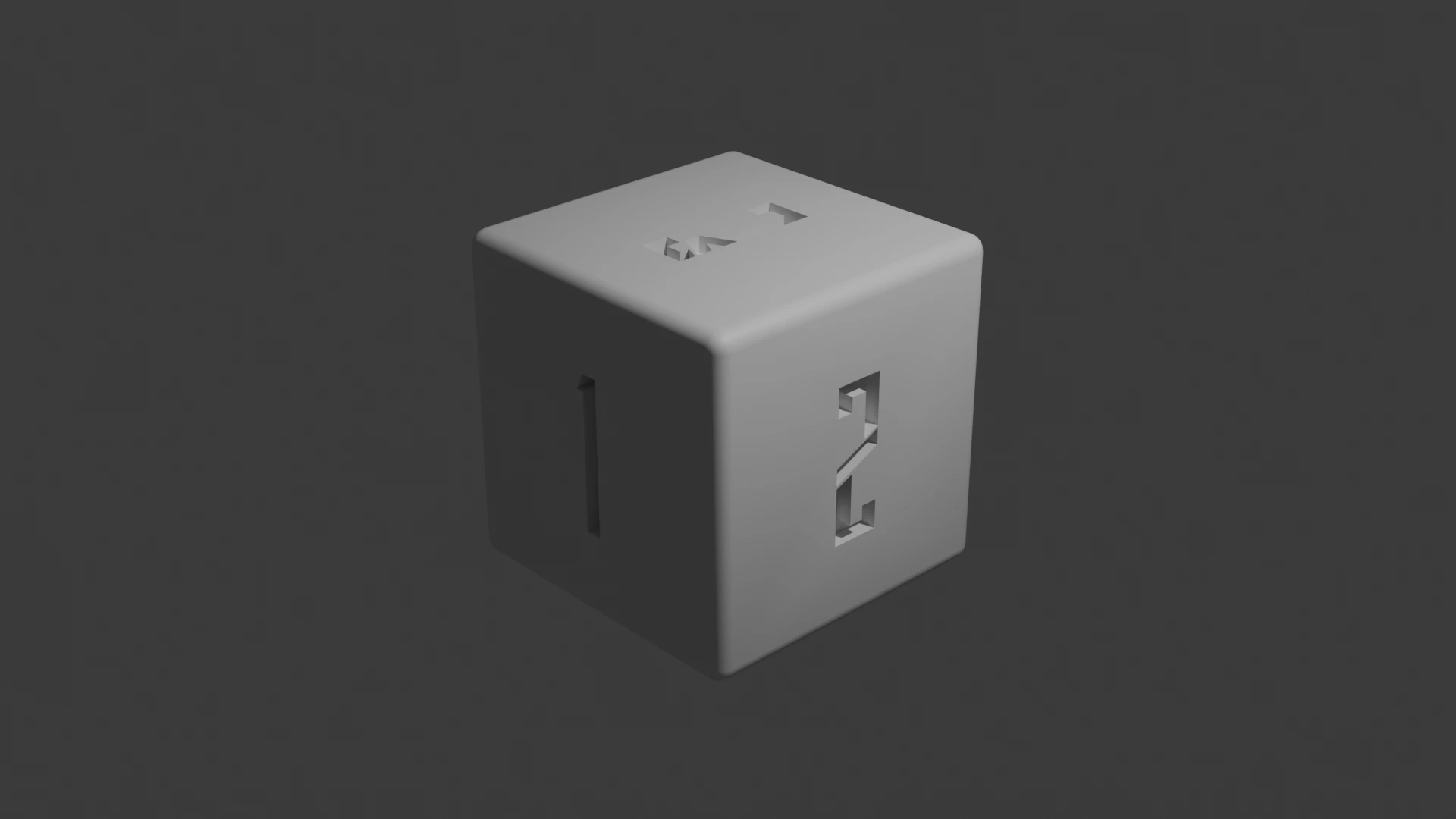 Le set comprend 6 dés modélisés à la main et par script : D4 (tétraèdre), D6 (cube), D8 (octaèdre), D10 (trapézoèdre pentagonal), D12 (dodécaèdre) et D20 (icosaèdre). Pour chaque dé j'ai gravé les chiffres en booléen avec la police "Legionary Condensed Tall". Les faces opposées respectent les règles classiques (somme de 7 pour le D6, 9 pour le D10, 13 pour le D12, 21 pour le D20). Les arêtes sont arrondies avec un modificateur biseau + subdivision pour un rendu réaliste. Le 6 et le 9 portent un point distinctif. Le slicing a été réalisé avec ChituBox pour impression sur Elegoo Mars 5 Ultra (résine MSLA).